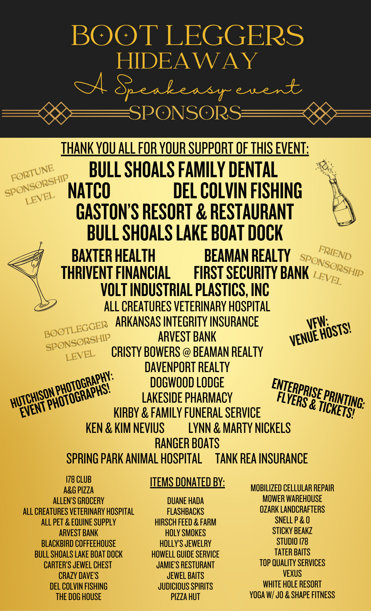 Bootlegger's Hideaway - Dinner Party with Dancing, Murder Mystery: A Play in Three Acts, and Live Music by the MelodaJazz Band, plus a Silent Auction offering a chance to bid on amazing packages from our local businesses.